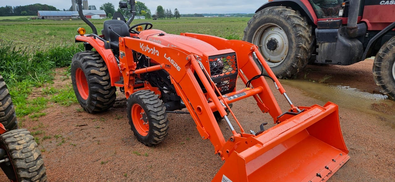 3-range hydrostatic drive, ROPS, R4 industrial tires, Fluid in tires, 3-point, 540 PTO, LA526 loader with 66″ quick attach bucket and cutting edge. The grill guard also has a mesh brush guard for more protection.